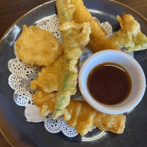 Shrimp tempura, cucumber, avocado topped with crab, scallop, masago*