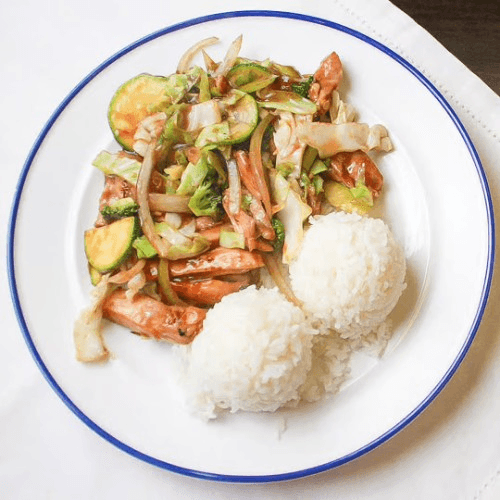 Crab, avocado, cucumber topped with seared salmon, spicy mayo