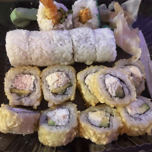 Crab, shrimp tempura, cream cheese, masago, cucumber topped with avocado, spicy tuna, crunchies