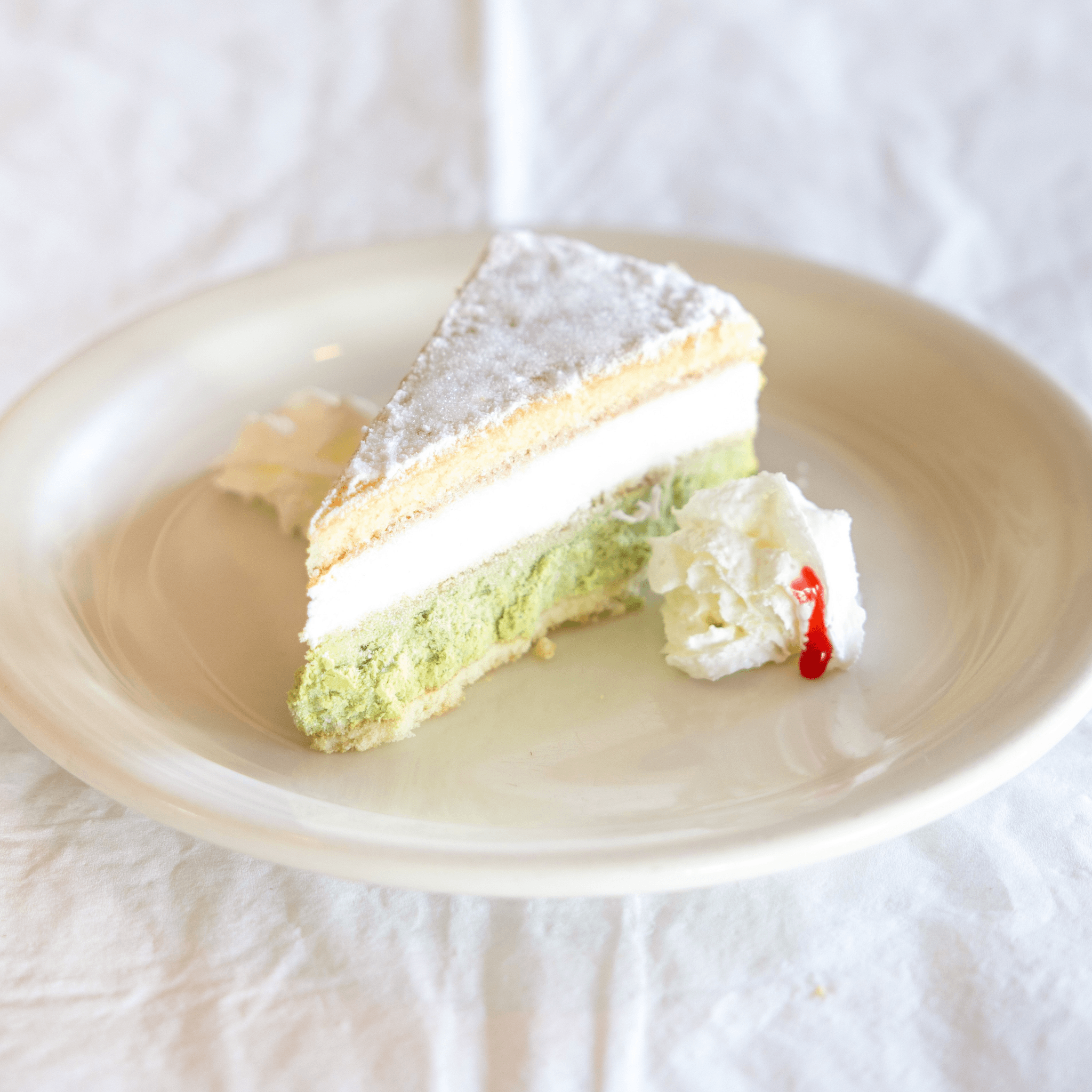Ricotta & Pistachio creams separated by sponge cake, rimmed with pistachio pieces, and finished with a dusting of powdered sugar
