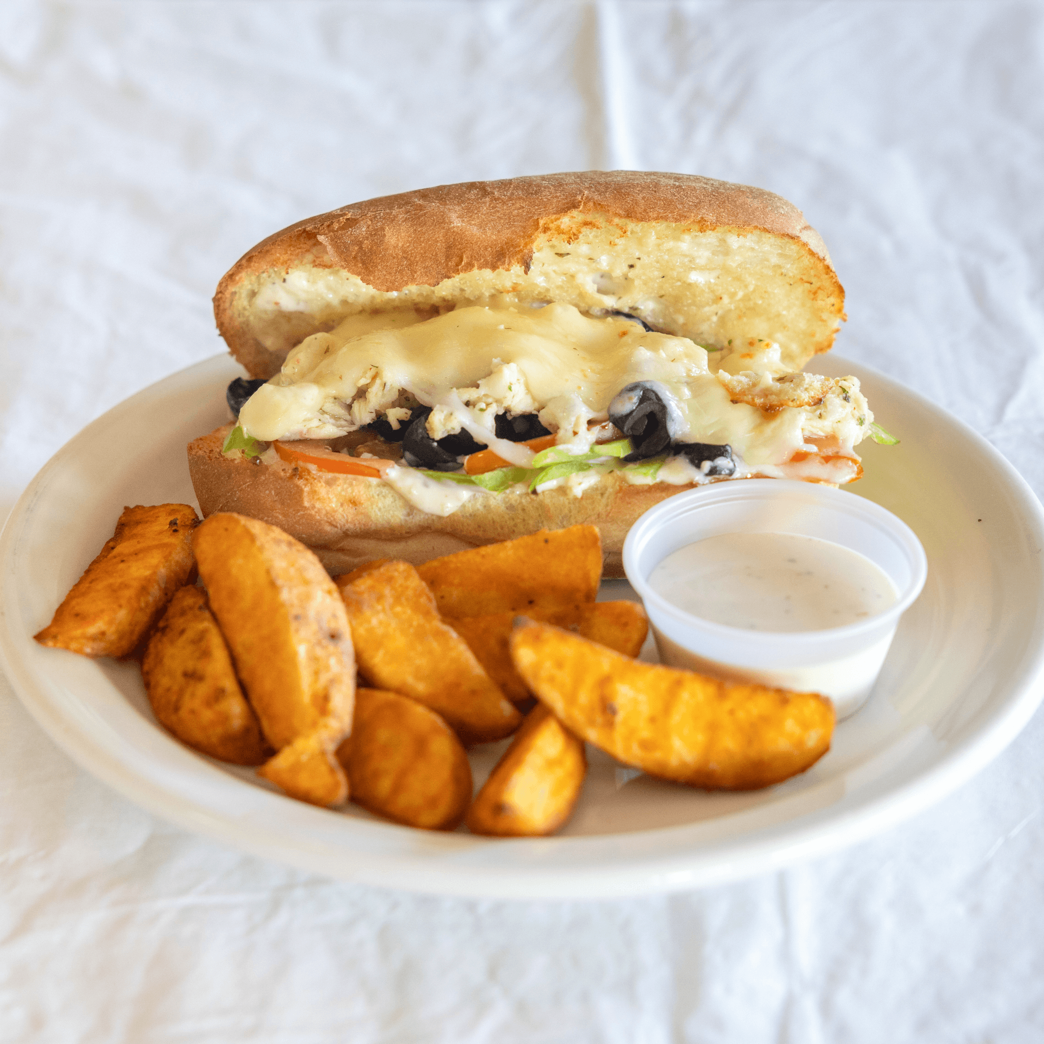 Diced Italian style chicken, breakfast bacon, green pepper, tomato, black olive, Swiss cheese and garlic ranch spread on French bread