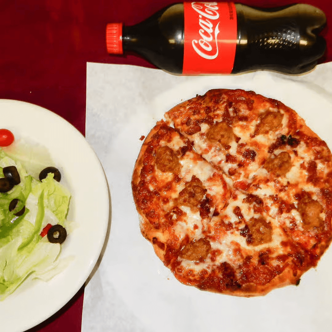 The Special includes a garden salad with your choice of dressing, an 8" pizza with up to 3 toppings and a bottle of soda.