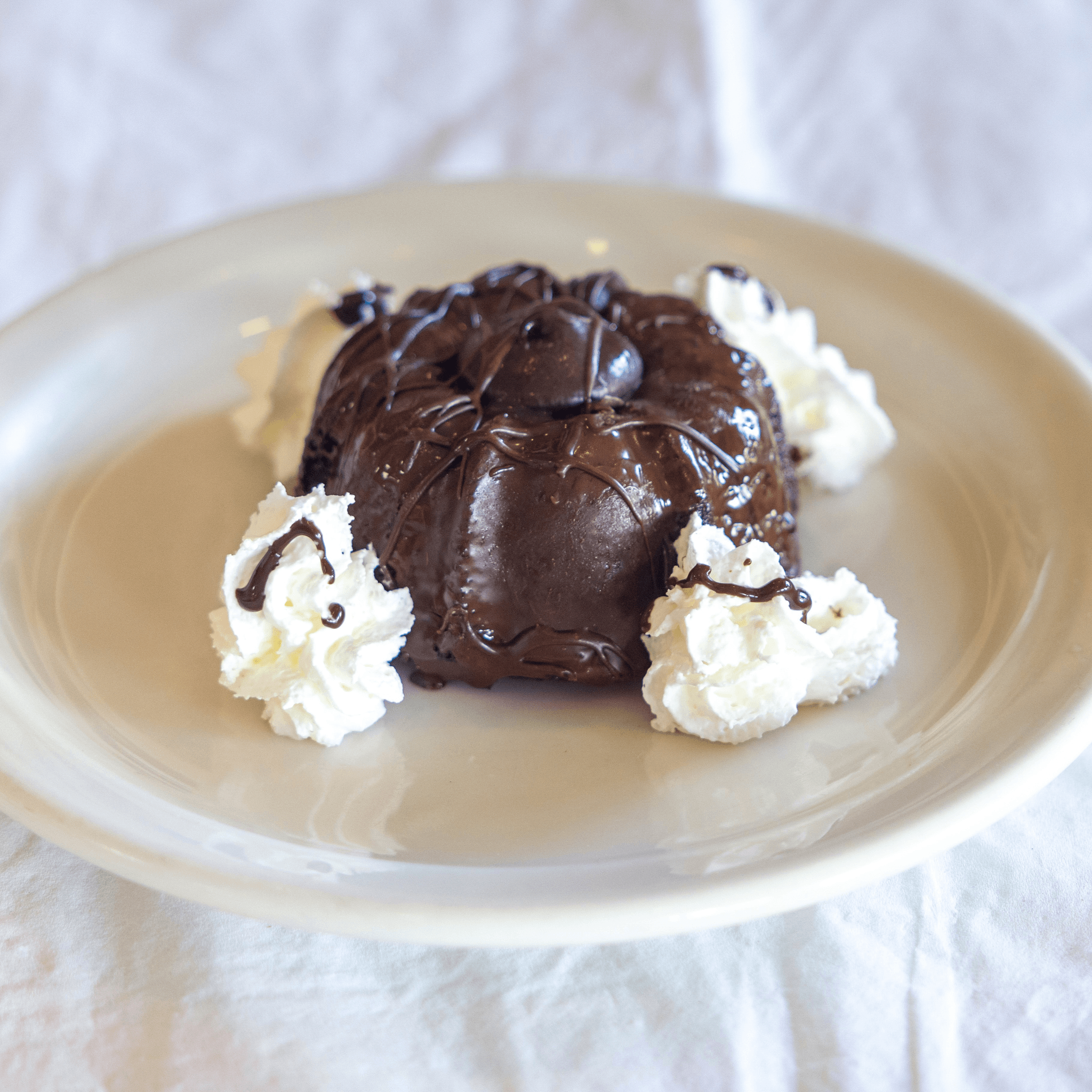 A rich chocolate cake served warm