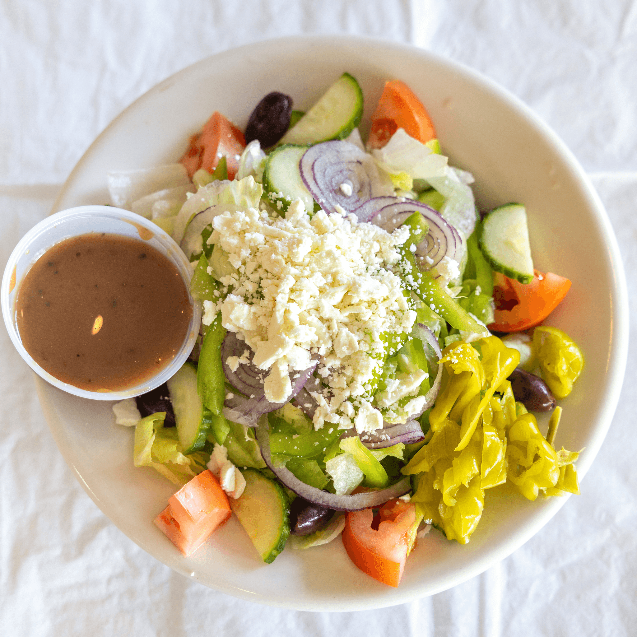 Freshly chopped iceberg lettuce, grape tomato halves, slice cucumber, Kalamata olives, julienne of green pepper, sliced red onion, pepperoncini, crumbled feta cheese and served with a home made balsamic vinaigrette on the side.