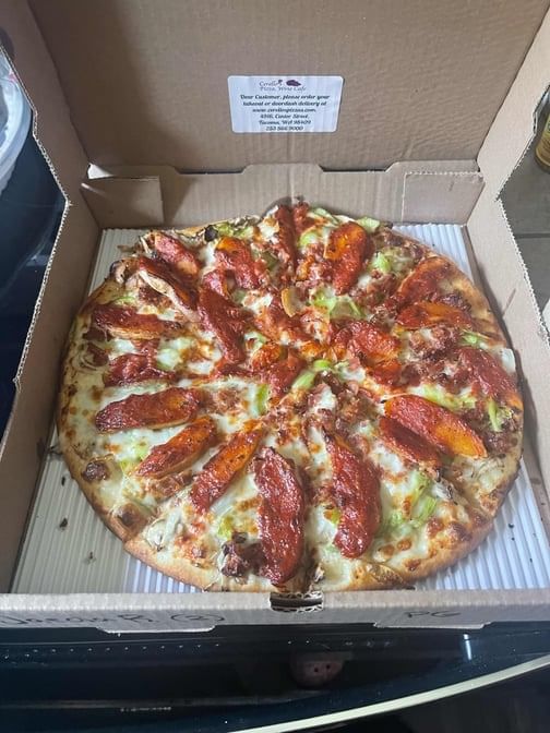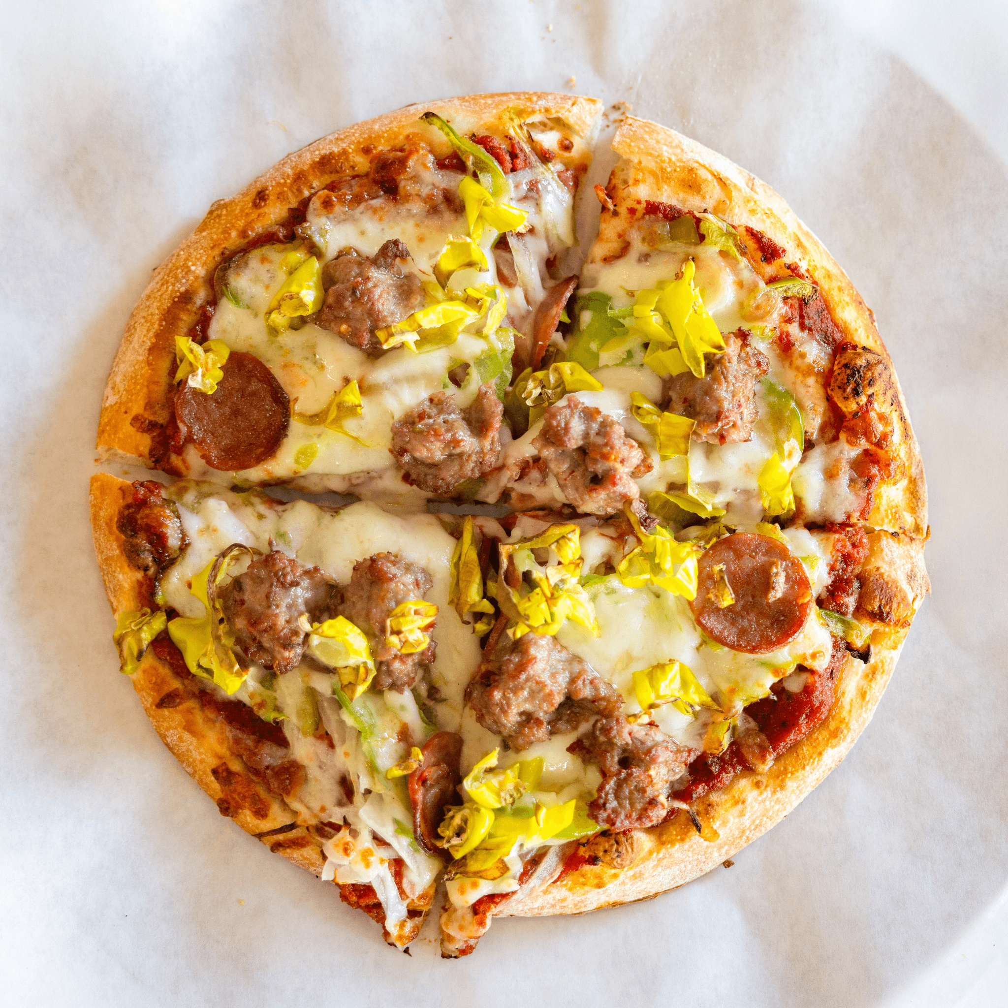 Spicy pepperoni, spicy Italian sausage, linguica, onions. green peppers, pepperoncini, spicy tomato sauce.