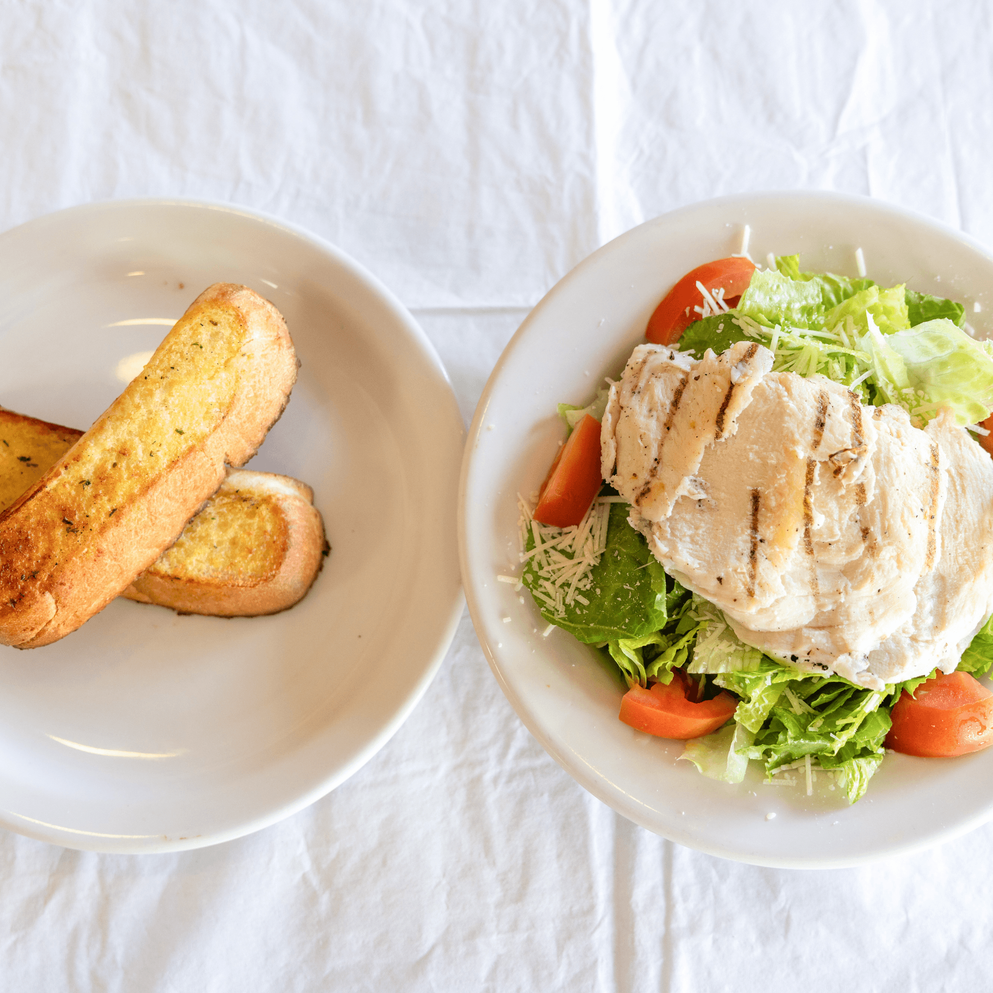 Grilled chicken breast cut on a bias and served on a bed of freshly chopped romaine, garnished with cherry tomatoes, Parmesan cheese and served with freshly baked garlic bread