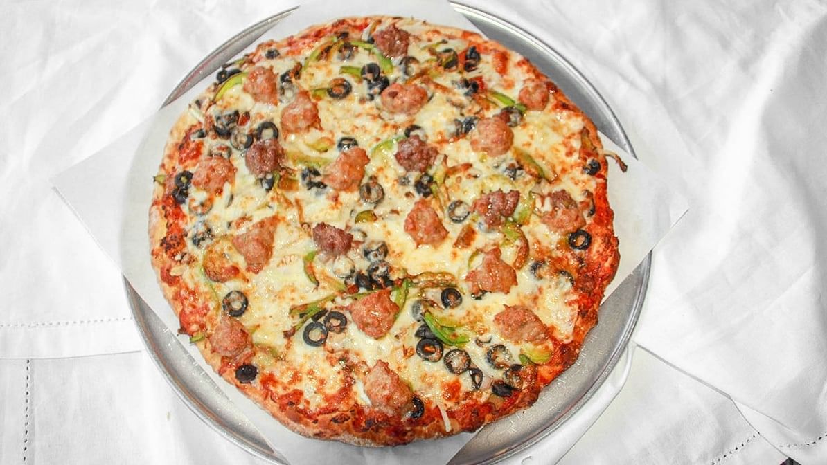 Pepperoni, mushroom, onion, green pepper, black olive, sausage, ground beef, homemade pizza sauce