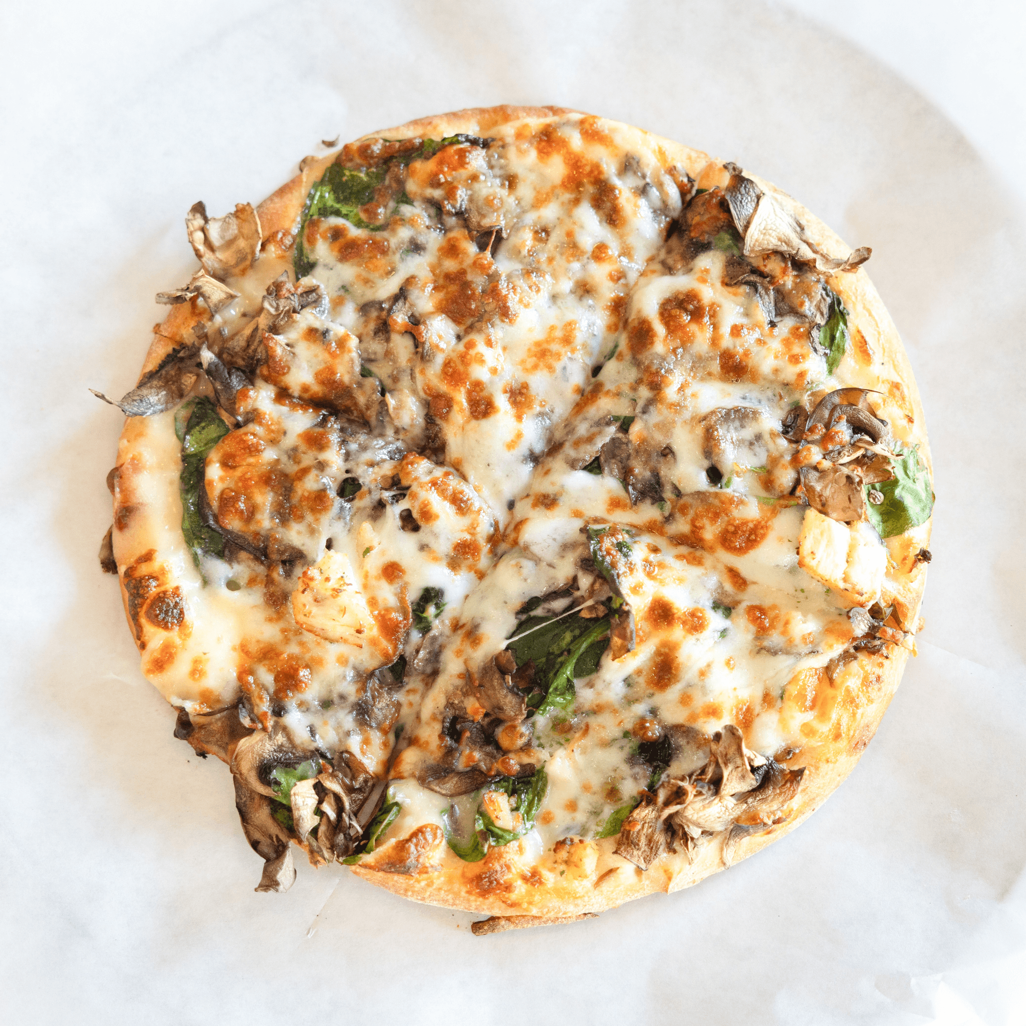 Chicken, spinach, fresh garlic, mushrooms, mozzarella cheese, creamy alfredo sauce