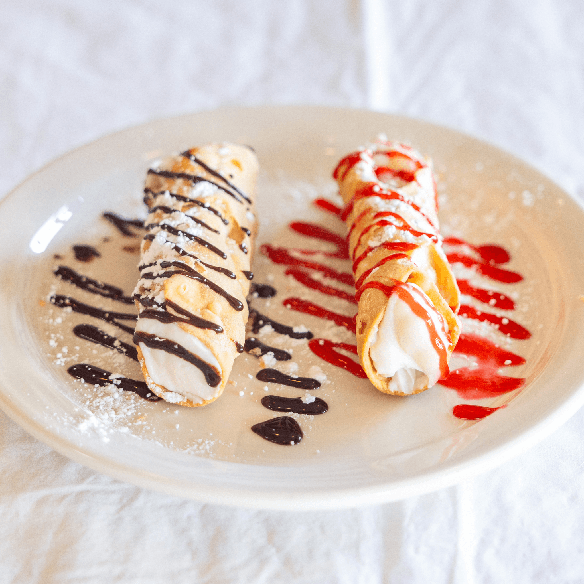Cylindrical Sicilian style pastry shells filled with a creamy ricotta and chocolate chip filling, topped with a rich flavored chocolate or raspberry syrup and sprinkled with powdered sugar