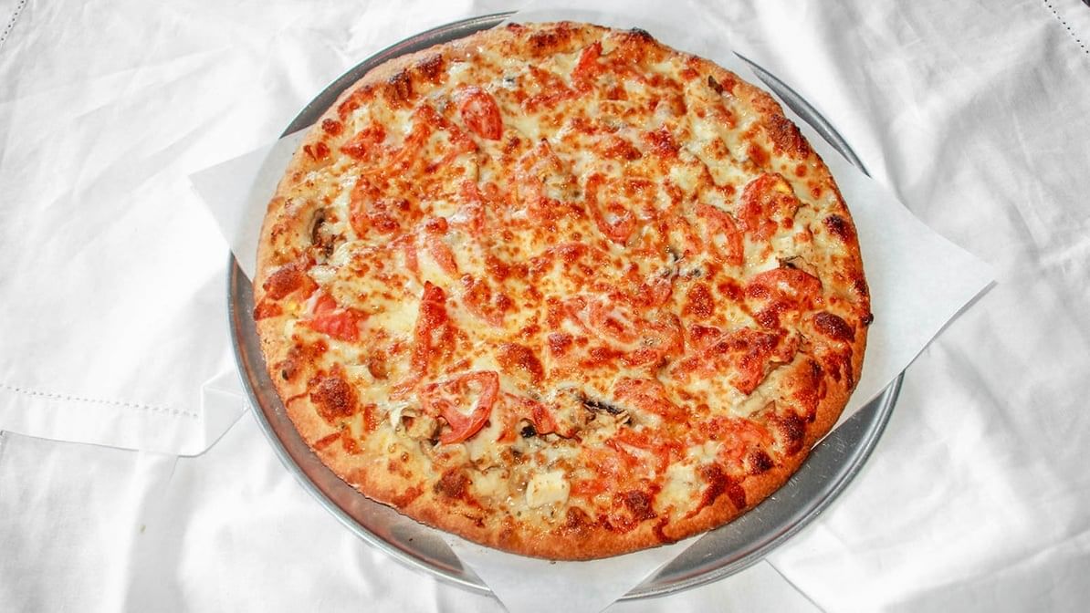 Pepperoni, mushroom, onion, tomato, chicken, garlic, savory ranch sauce