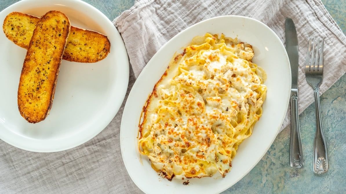 Spaghetti cooked al dente and then tossed with garlic, Alfredo sauce, artichoke hearts, diced Italian style chicken and topped with fresh mozzarella, baked