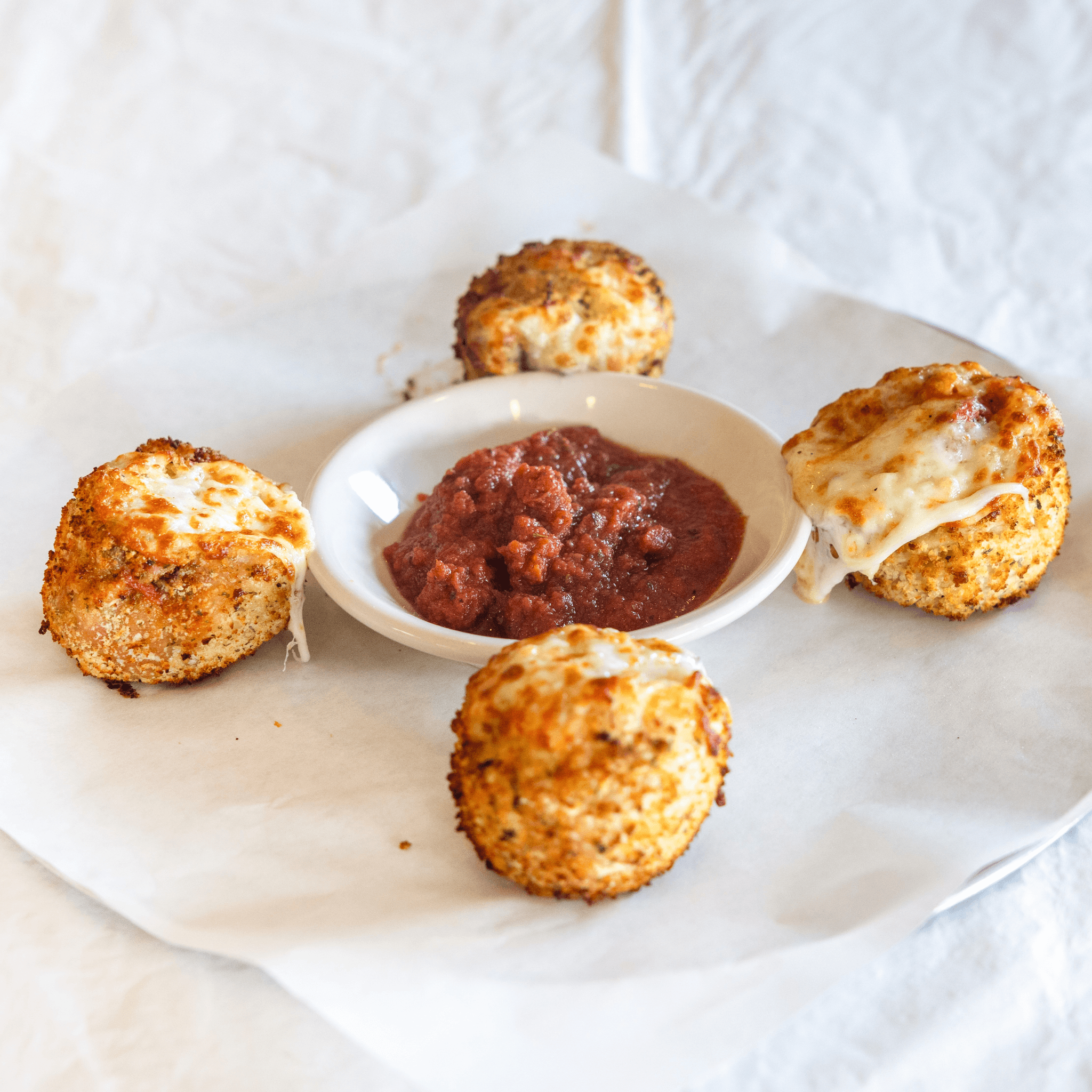 Delicious and moist, Italian style meatballs tossed in our homemade tomato sauce topped with a cheese blend coated with seasoned panko bread crumbs, baked and served with our signature house sauce