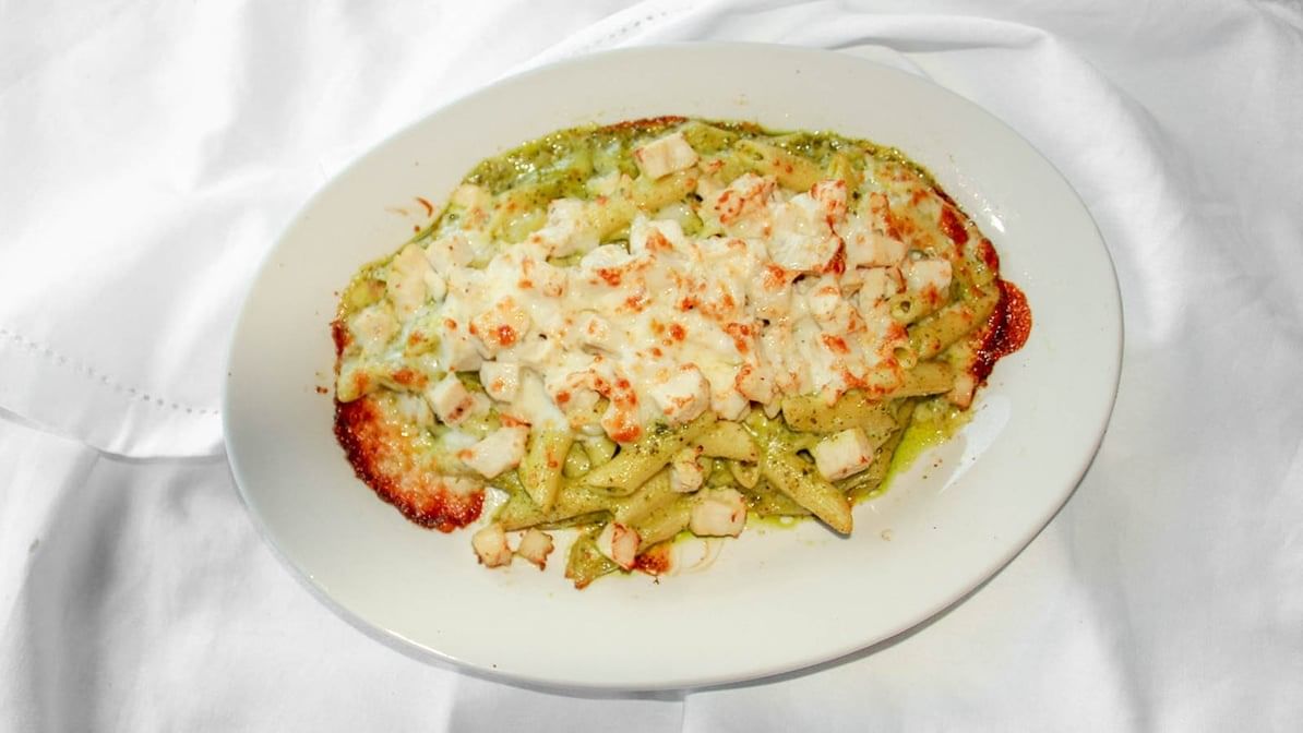 Penne tossed with roasted garlic, Italian style diced chicken, julienne sun dried tomatoes and a creamy pesto sauce