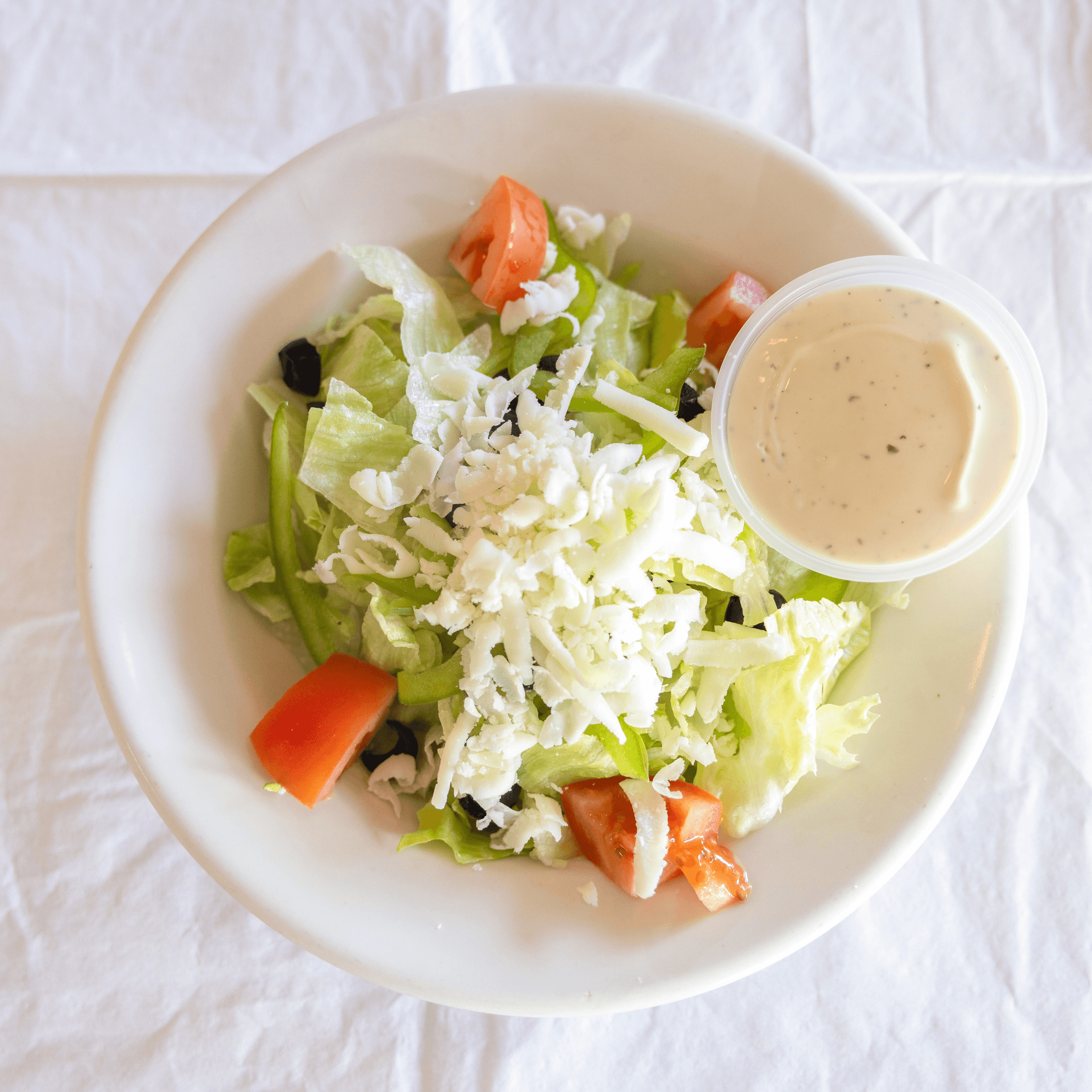Freshly chopped iceberg, sliced grape tomato halves, sliced black olives, julienne of green peppers and fresh mozzarella. Served with your choice of dressing on the side - ranch, Italian or Bleu cheese