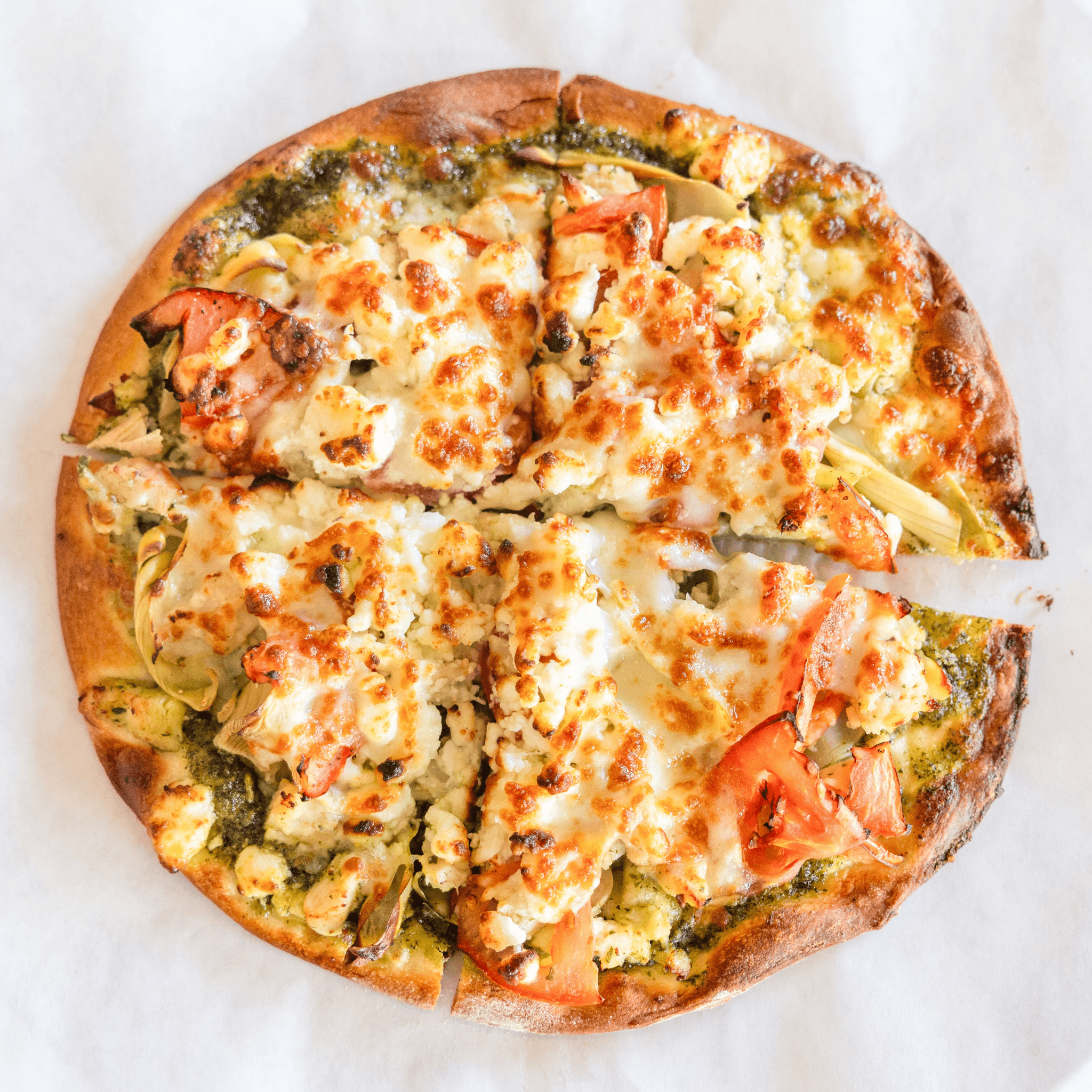Artichoke Hearts, sliced tomato. Chicken, fresh garlic, goat and mozzarella cheese