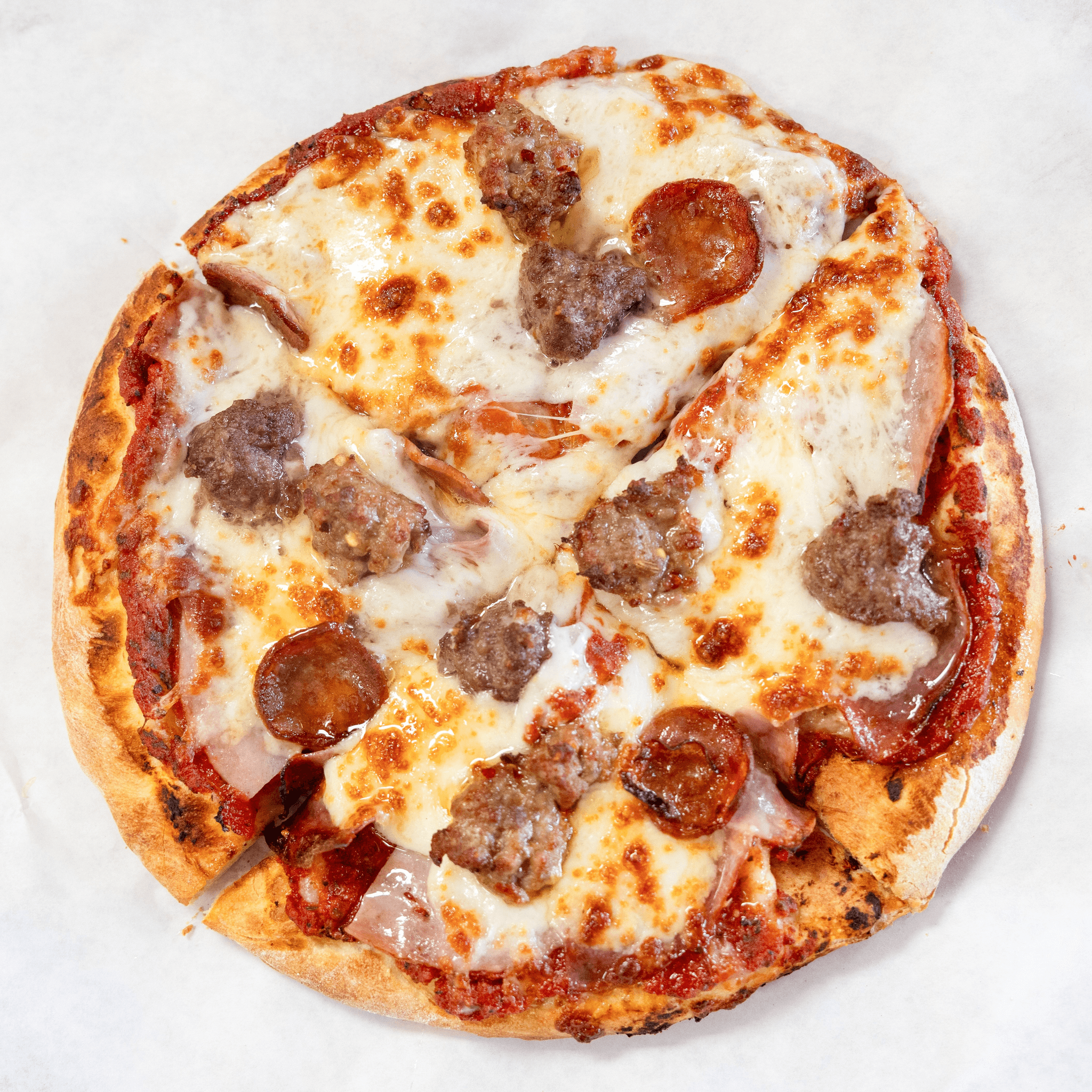 Pepperoni, salami, linguica, sausage, ground beef, Canadian bacon, homemade pizza sauce