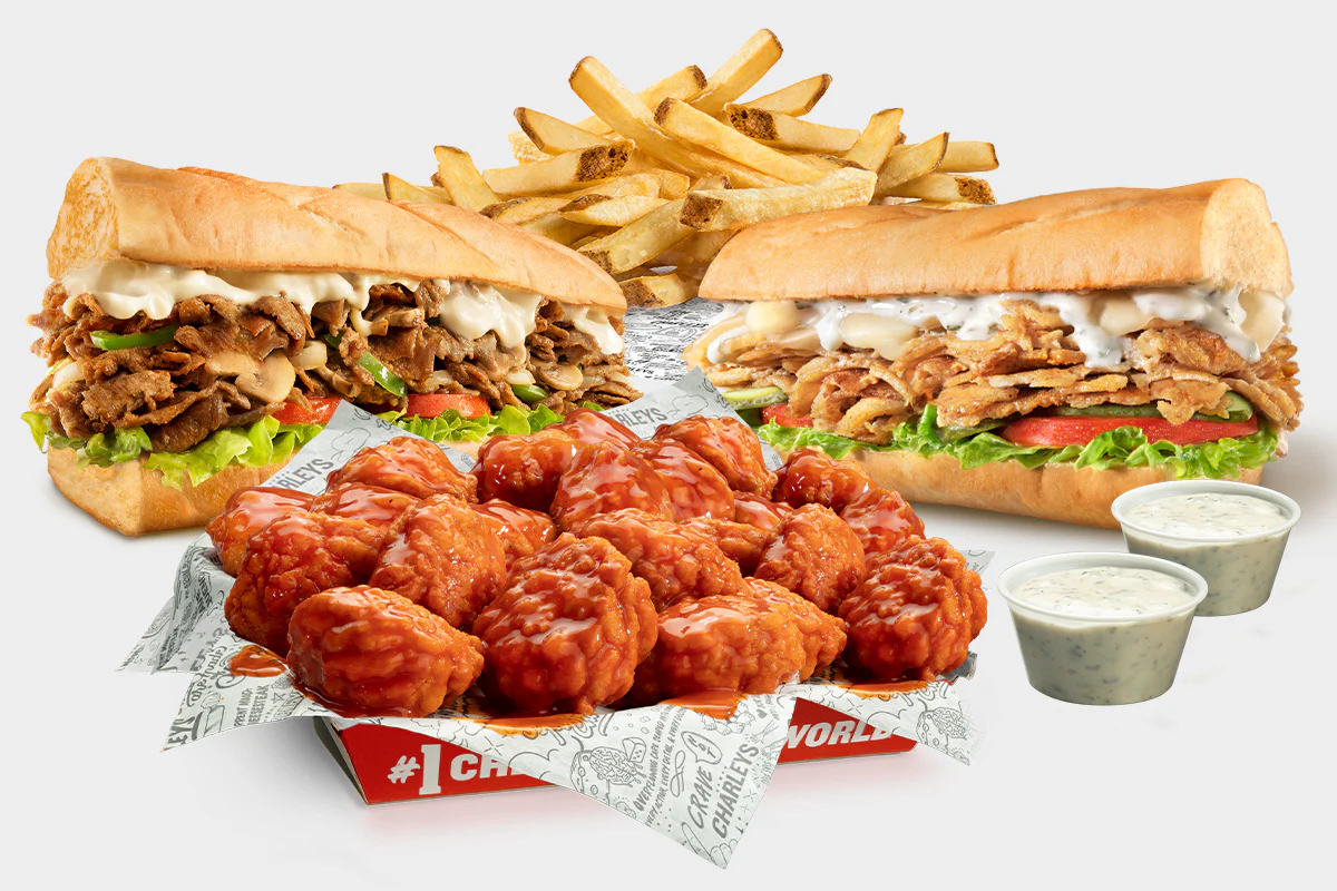 Includes 2 regular cheesesteaks (chicken or steak), 10 wings (boneless or classic), Large Fries, and your choice of 2 ranch or bleu cheese. Limit 2 per transaction